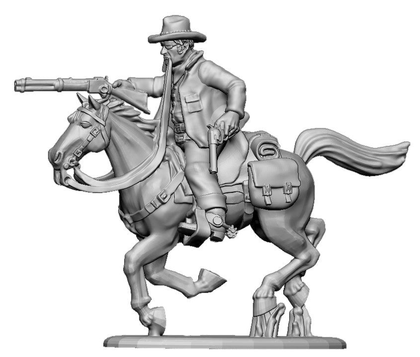 Mounted version of Bulldog Coburn, reigns between his teeth, galloping toward danger with rifle and pistol in hand!