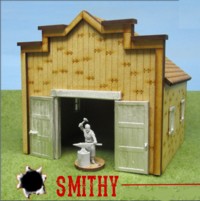 The 'Smitty ("Smithy," or Blacksmith) is a small shop building with a doorway high enough for a horse to come and go. The building's dimensions are roughly 4.5" square, with a door opening of just over 2" so the building can be used for a small livery, wagon shed, or blacksmith. There is no floor (assumed dirt floor). Includes MDF and plastic parts.