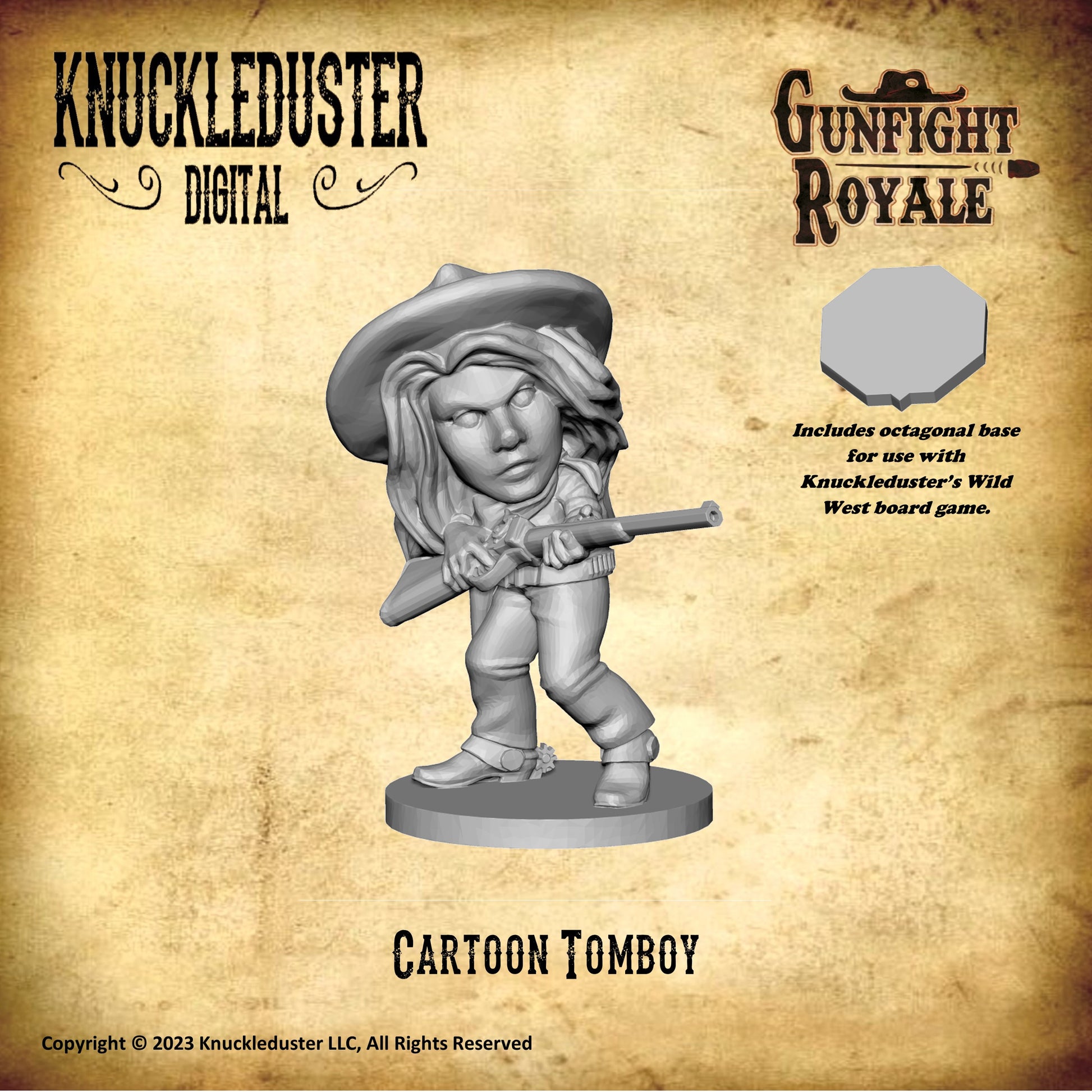 A cartoon rancher's daughter from Knuckleduster's shoot-em-up boardgame's starter set. Includes the character's STL and separate octagonal base used for play.