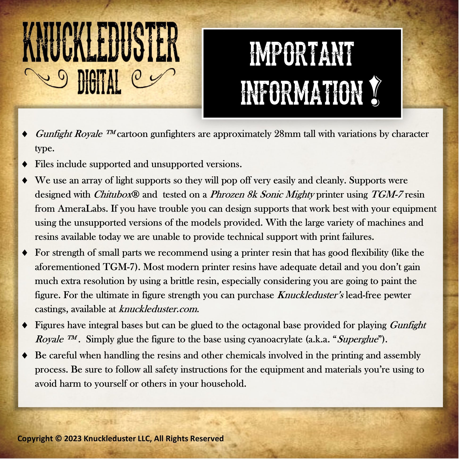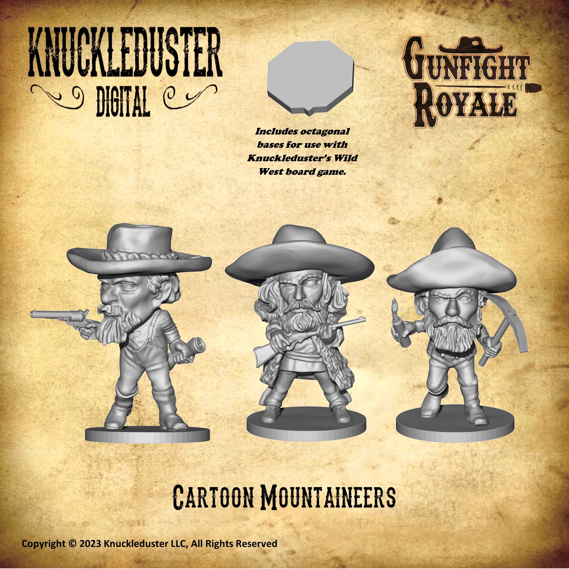 Three backcountry ruffians from Knuckleduster's shoot-em-up boardgame's original series of expansion packs. Includes 3 characters and the octagonal base used for play.