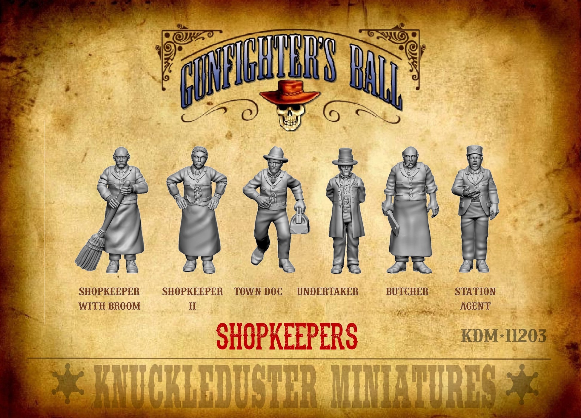 Populate the streets of your wild west town with storekeepers and other businessmen. Included in this pack are a railroad station agent, town doctor, two store clerks, an undertaker, and a butcher.
