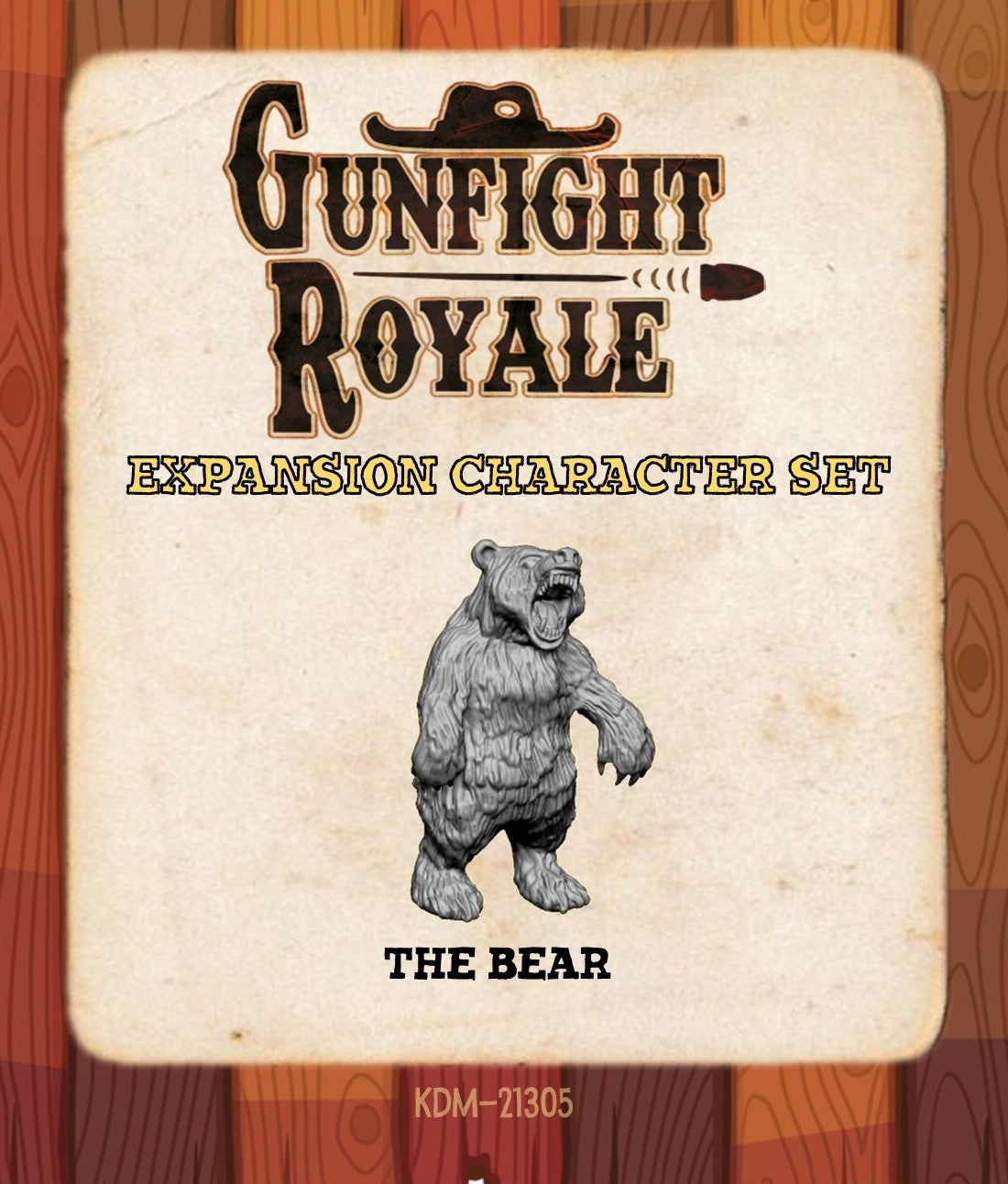 A cartoon-style, plastic bear for Gunfight Royale. He comes with his character card and four wounded paw tokens. Players roll-off each round to see who controls the bear!