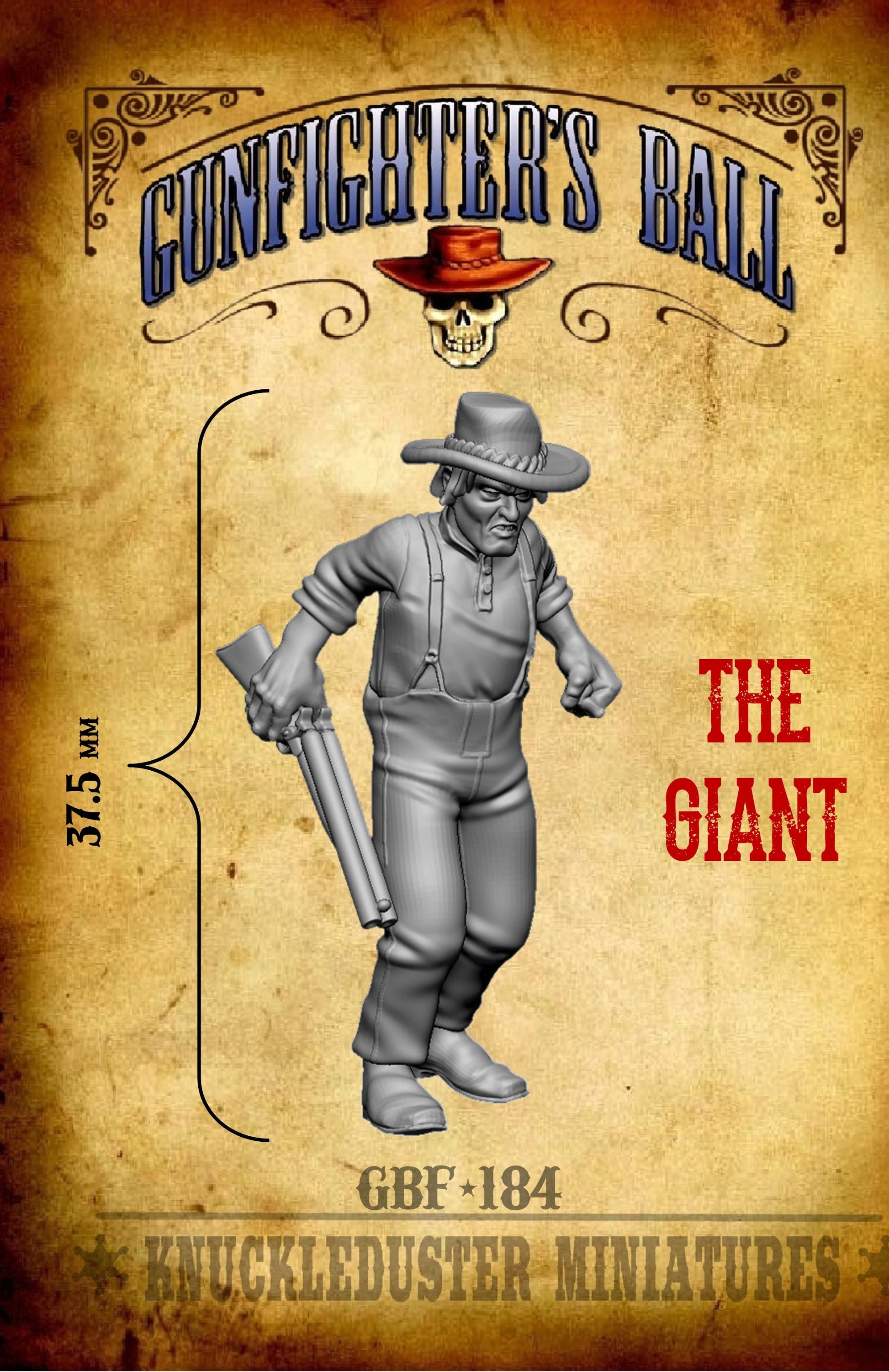 A big, raw-boned giant of a man carrying double-barreled, four-bore rifle (and Elephant Gun). Figure stands 37.5mm tall (not a fantasy giant, but a very, very large man).