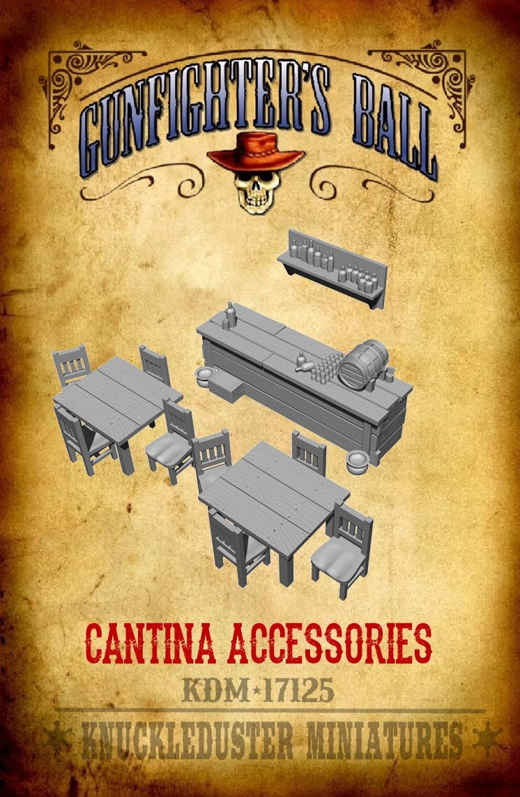 A huge set of accessories for the interior of a Cantina or Saloon south of the border. Includes a rough bar, booze rack, two tables and eight chairs.