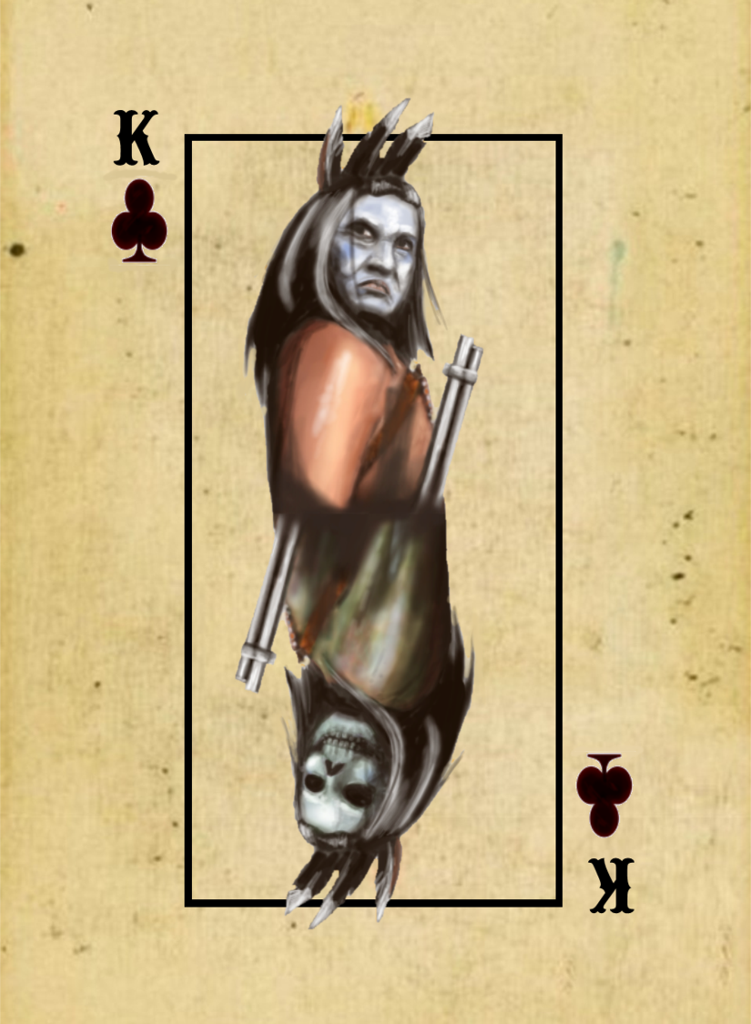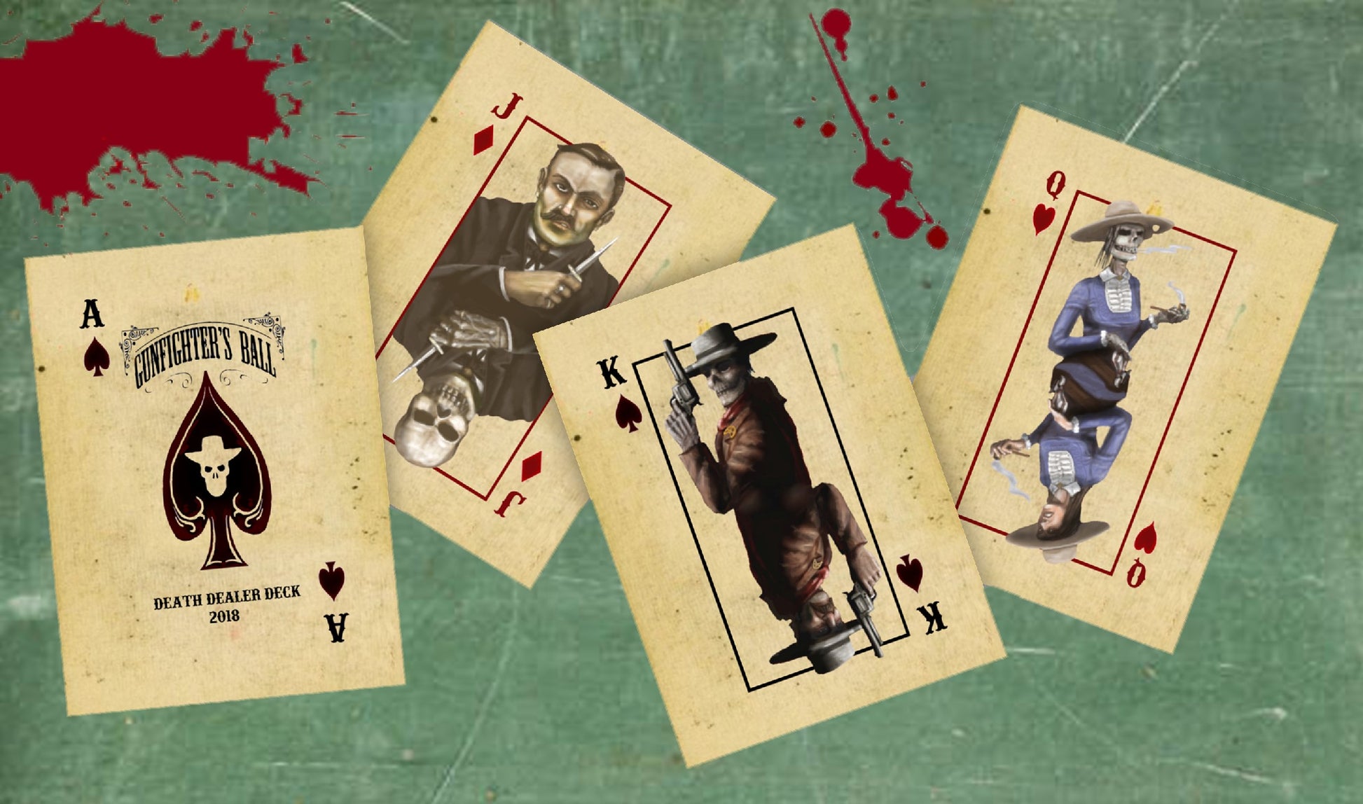 A poker deck featuring original artwork, for use as Action Cards (the initiative draw deck) in Gunfighter's Ball. Face cards sport gunfighters as zombies when held upside-down. To quote the deck: "52 action cards for Gunfighter's Ball depicting the sad consequences of living by the gun.