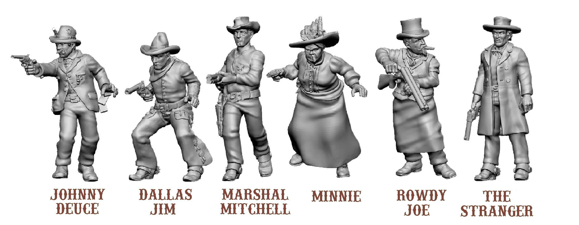 A roundup of the essential game accessories, plus a variety pack of figures, the Cowtown Characters. Includes the complete softcover rule book, the infamous Black Deck, Gunfighter's Ball dice, Cowtown Characters, and Character Card Booster Deck I, which includes their cards and 14 others.