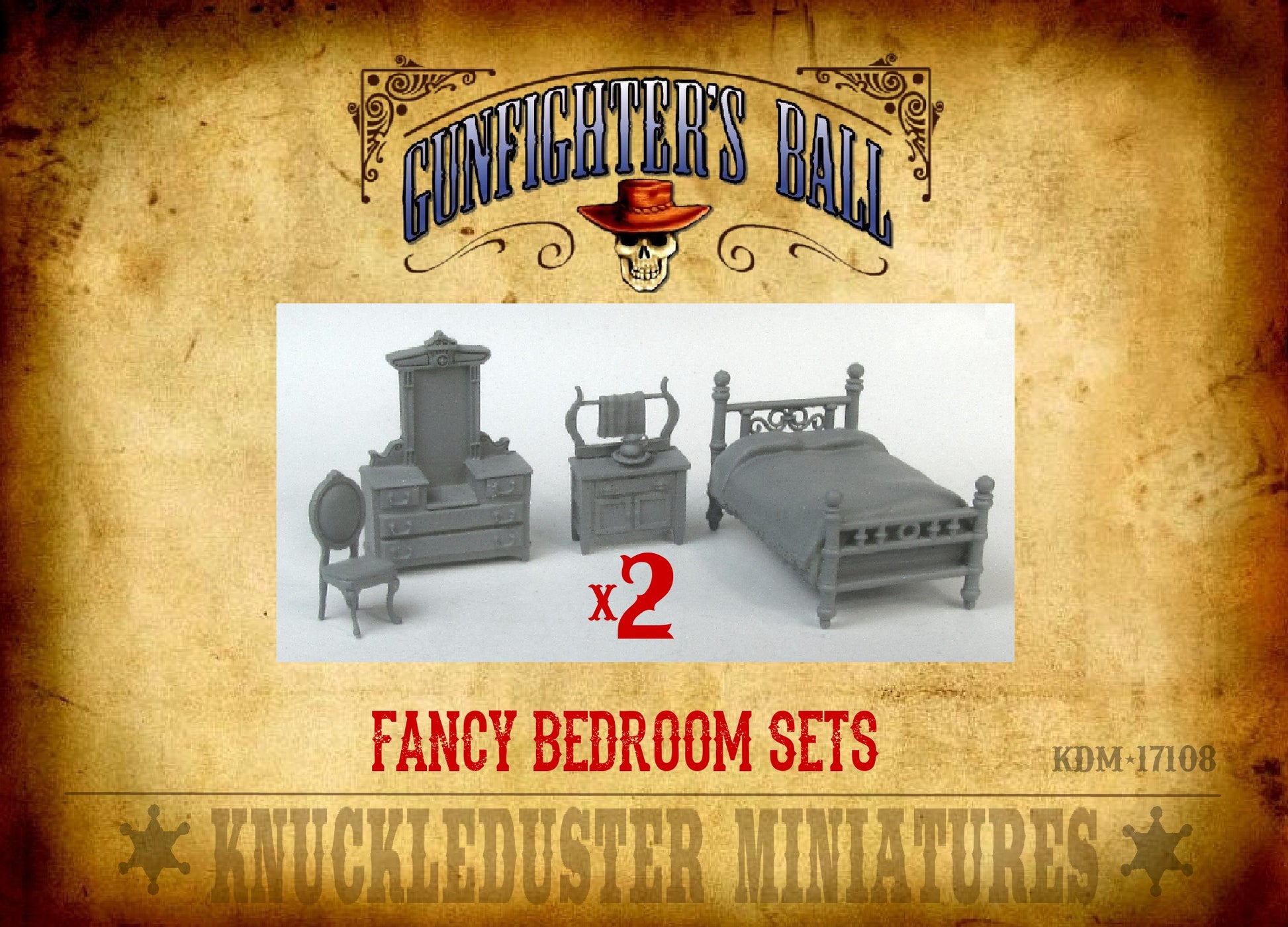 Furniture for two fancy bedroom sets. Includes two each: brass-style double-bed, wash stand, dresser, fancy side chair.