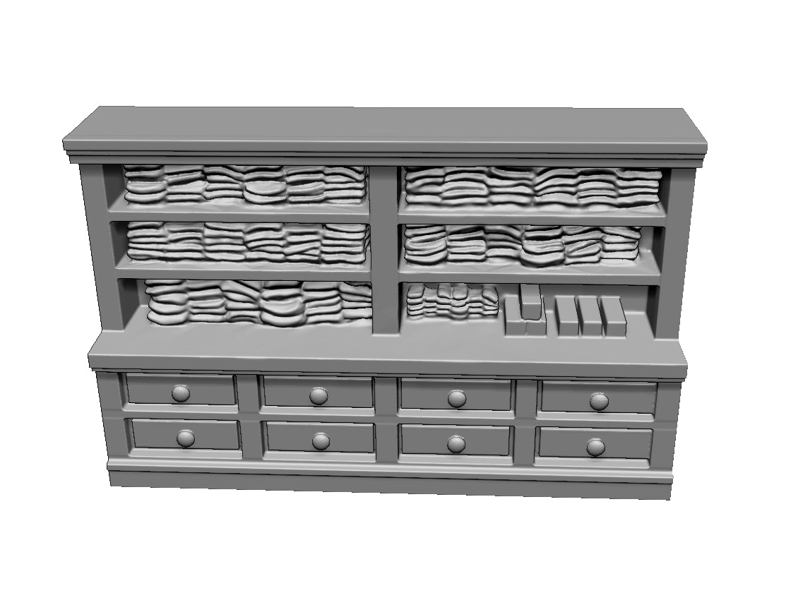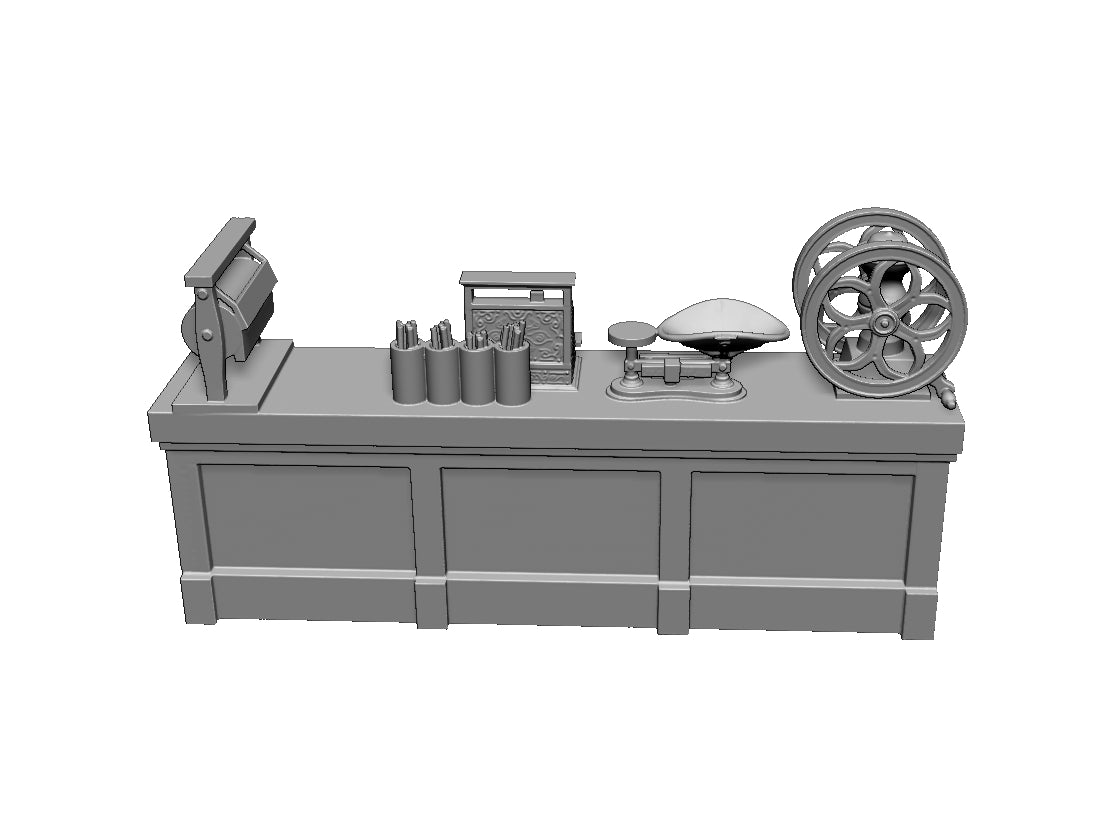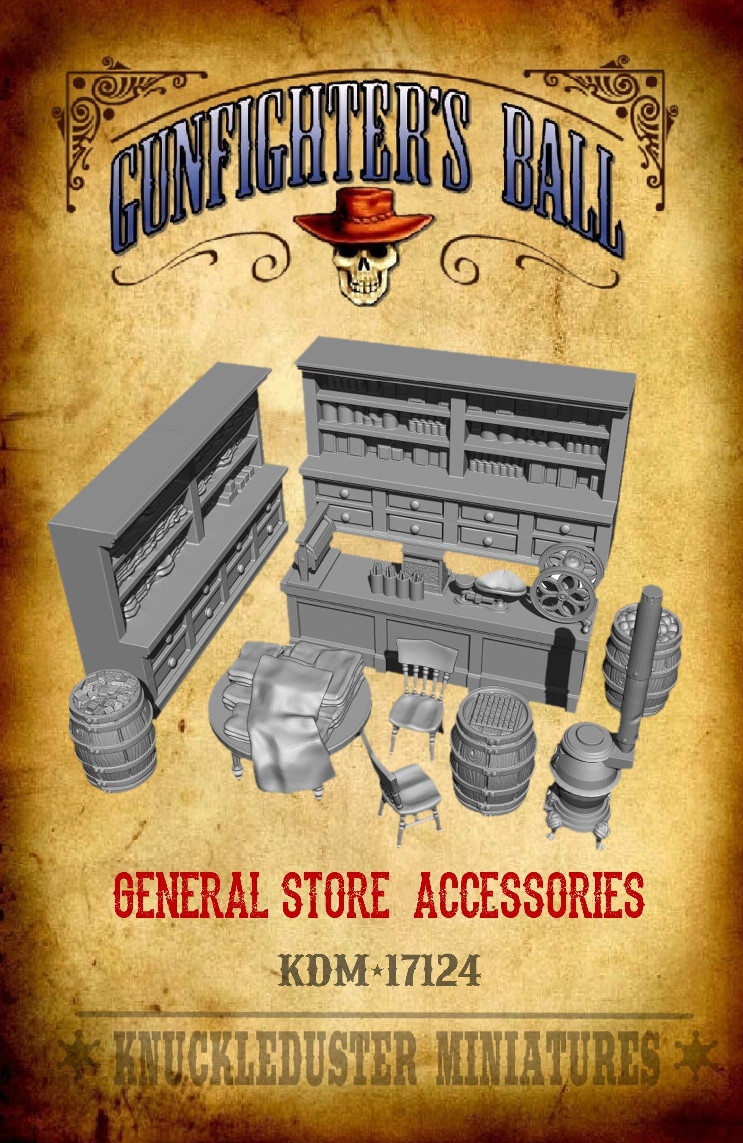 A huge set of accessories for the interior of a general store. Includes two full product cases, one with linens and another with groceries. It also includes a store counter with scale, coffee grinder, candy jars, butcher paper dispenser, and cash register built-in (no assembly required). There are two chairs and a barrel with a checker game on it, plus a stove to sit next to while having a game on a lazy desert afternoon. A table covered with blankets and folded fabrics, a cracker barrel, and a barrel of produce round out the set.