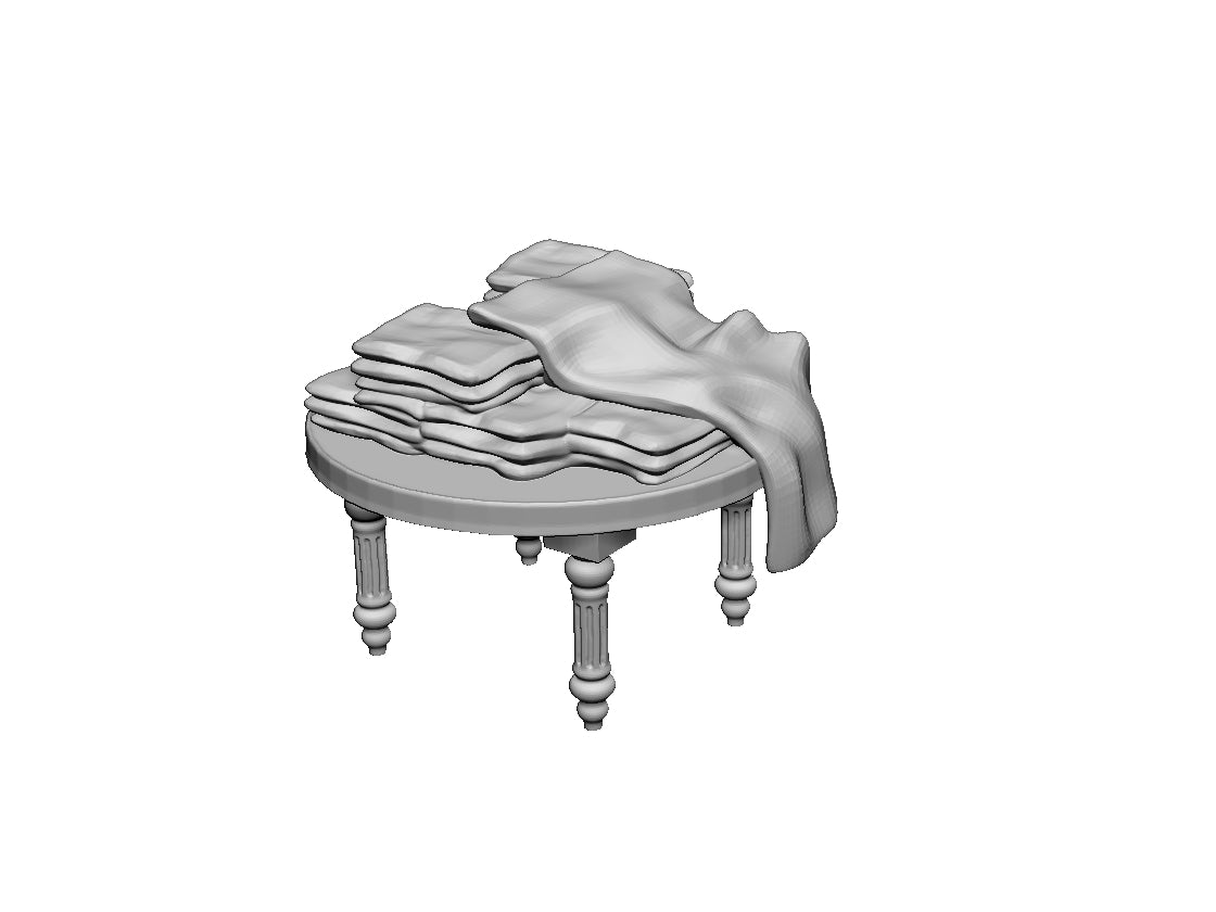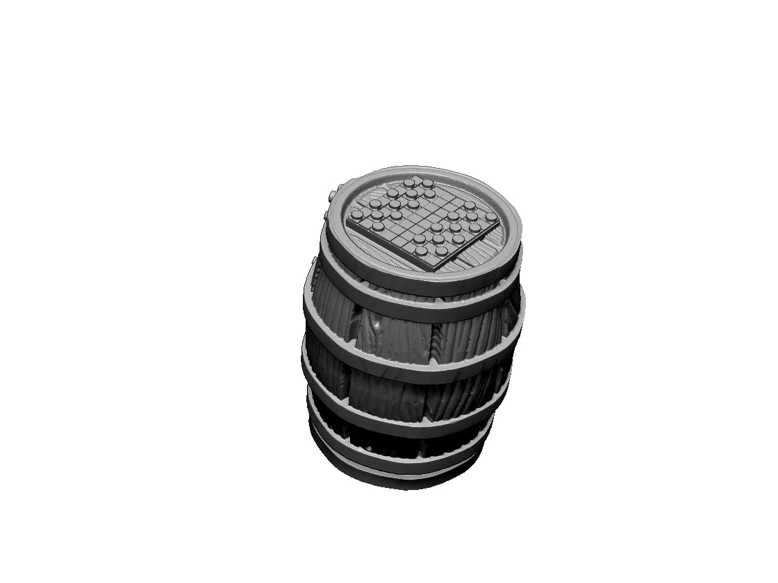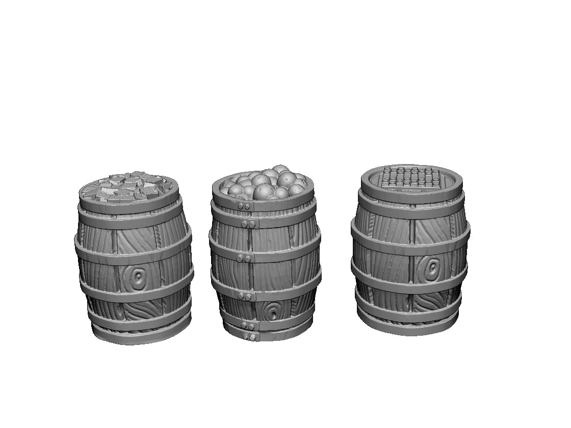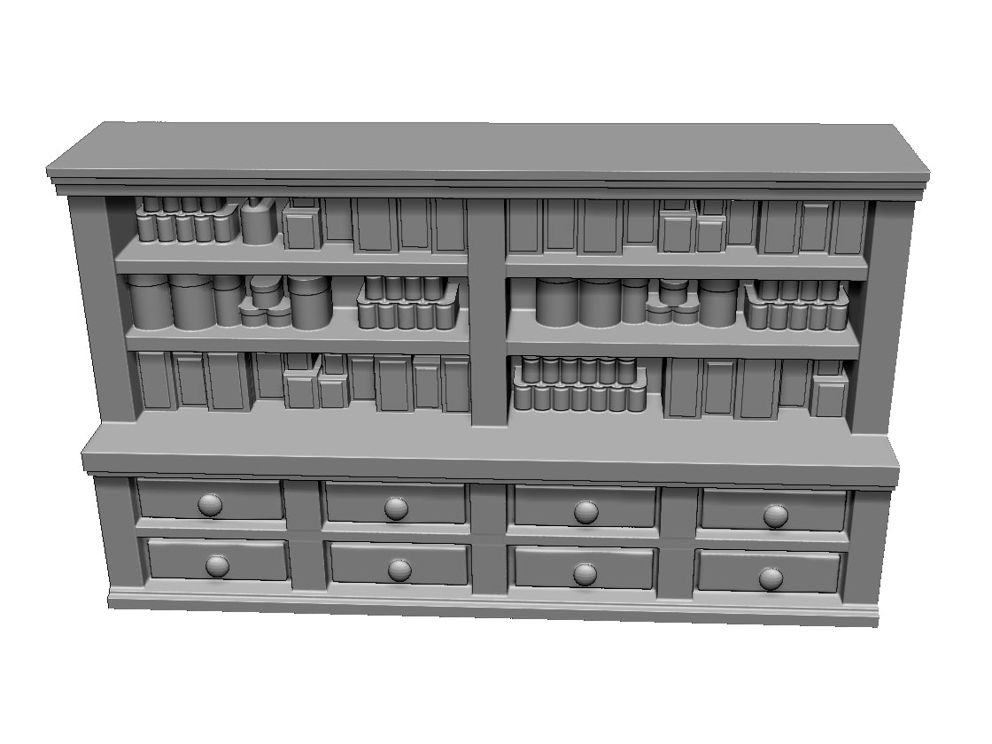 A huge set of accessories for the interior of a general store. Includes two full product cases, one with linens and another with groceries. It also includes a store counter with scale, coffee grinder, candy jars, butcher paper dispenser, and cash register built-in (no assembly required). There are two chairs and a barrel with a checker game on it, plus a stove to sit next to while having a game on a lazy desert afternoon. A table covered with blankets and folded fabrics, a cracker barrel, and a barrel of produce round out the set.