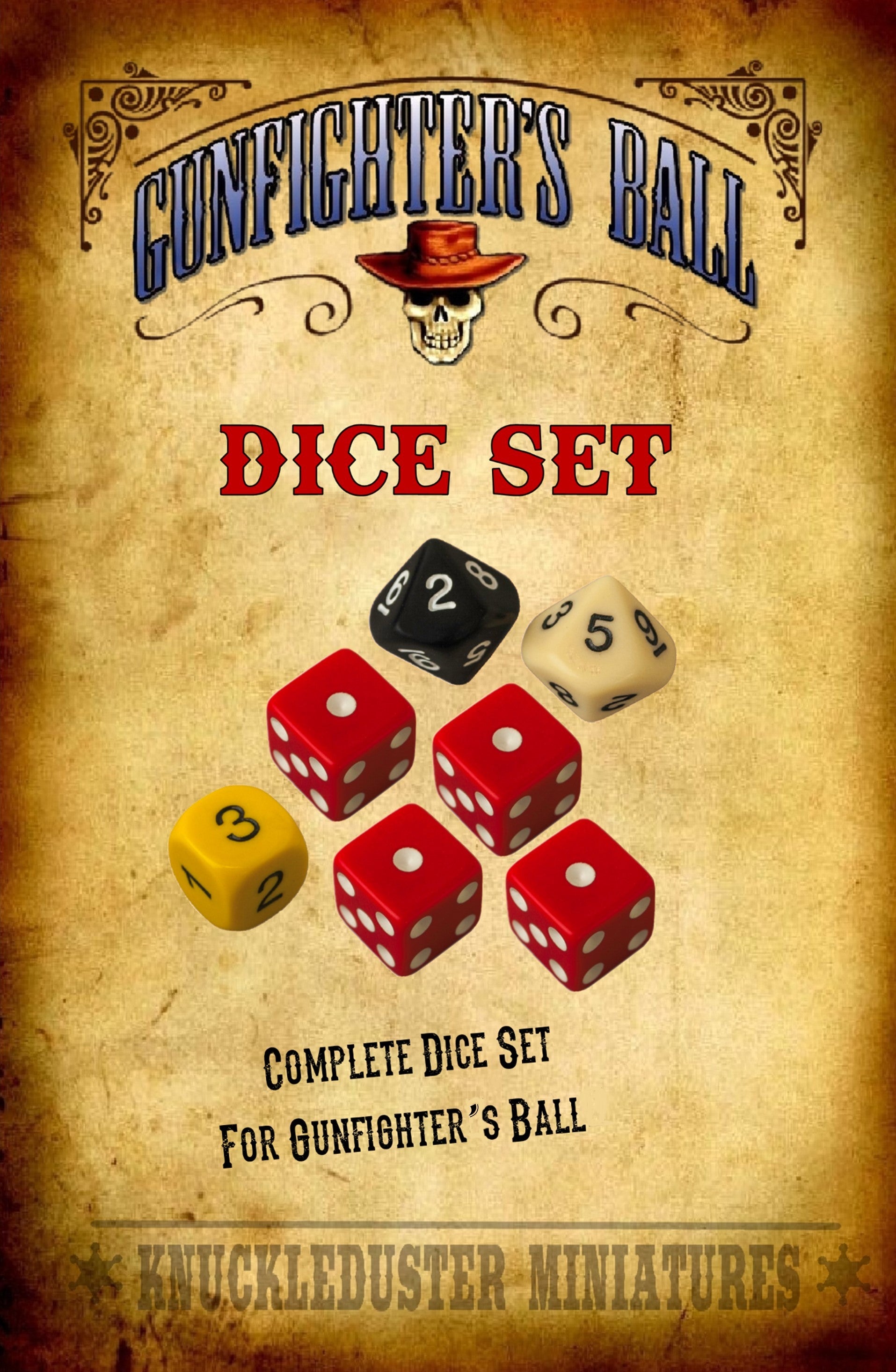 A set of seven dice used in Gunfighter's Ball, the tabletop Wild West shootout game. Includes 4 D6s, 2D10s (of two different colors), and a cubic D3.