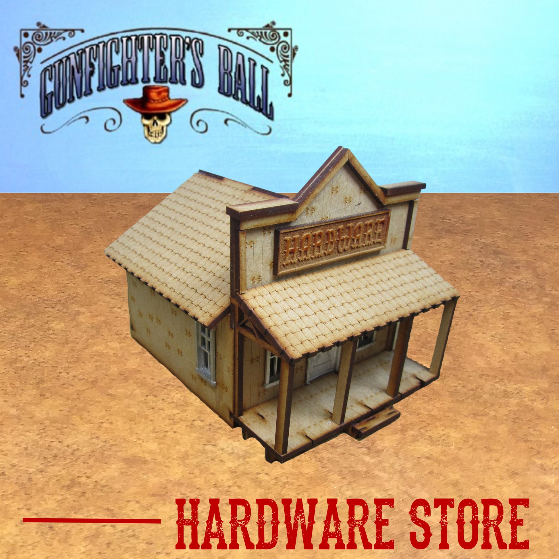 The title of the kit is "Hardware Store" but of course it can be used for any front street establishment in an old west town, from drug store to billiard parlor. The distinctive feature of this kit is the peaked shape of the false front, giving your main street some variety.