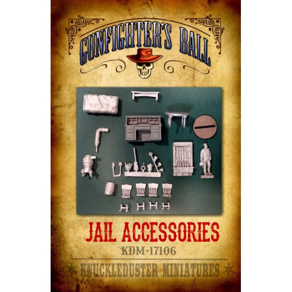 Everything you need to equip your Hollywood western jail: rolltop desk, gun rack, stove, table, chairs, cot, powder keg, prisoner, bench, and sprues with tin cups, coffee pot, broom, key, bucket, spitoon, and candle.