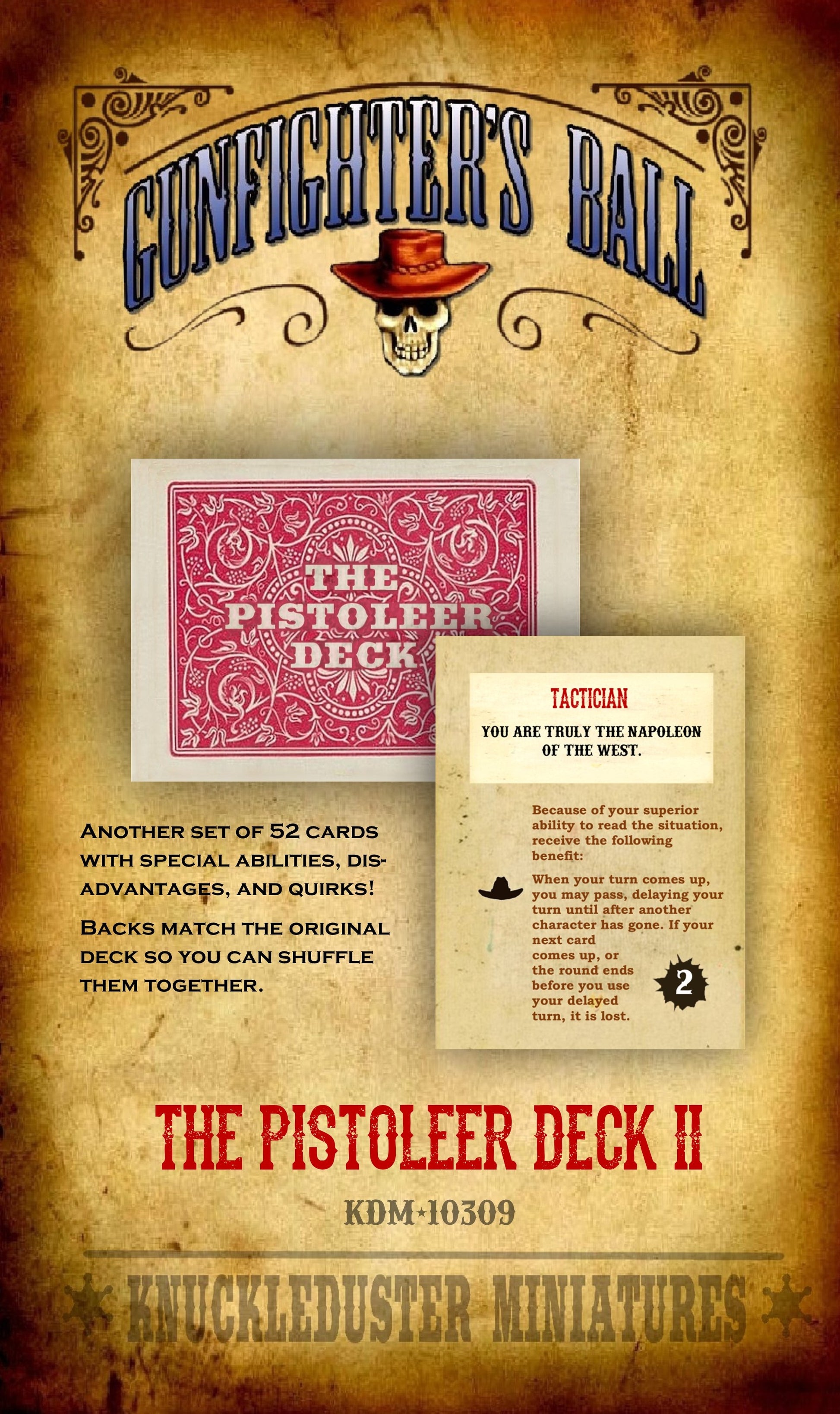 52 more special abilities and quirks that bring your Gunfighter's Ball characters to life. The backs of these cards match the Pistoleer I deck, so you can shuffle them together for 104 special abilities!